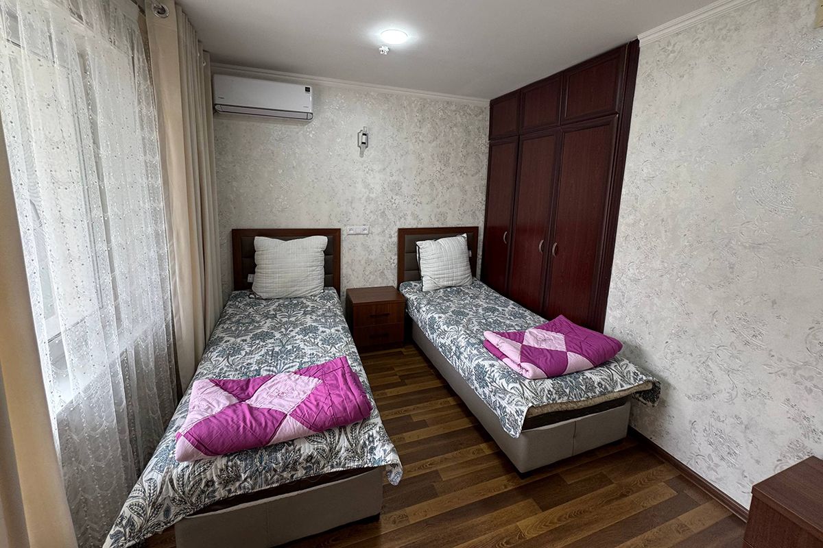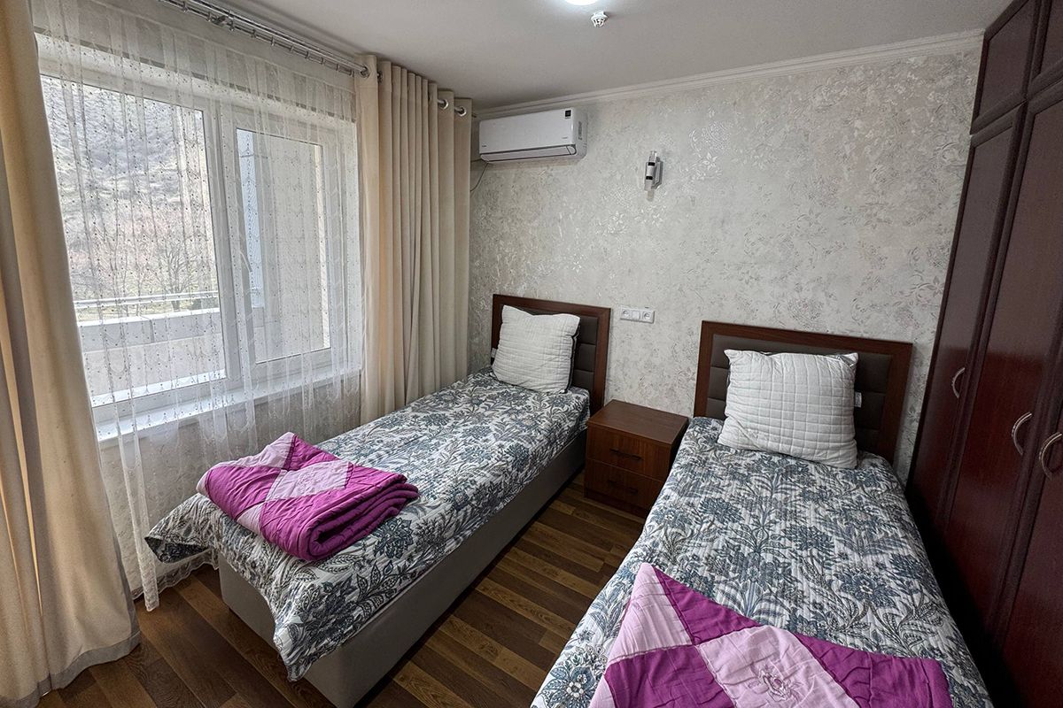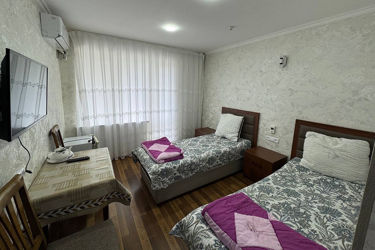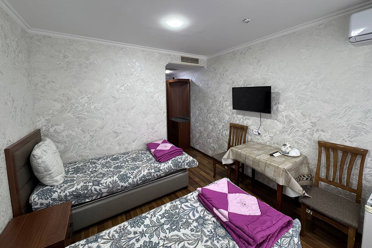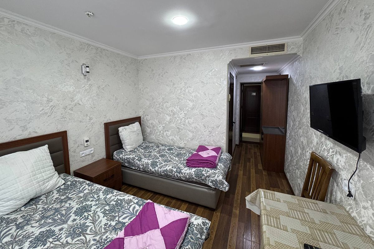 Кровати полуторки, столик и стулья, тумбочки, шкаф, телевизор, кондиционер, чайный набор посуды.